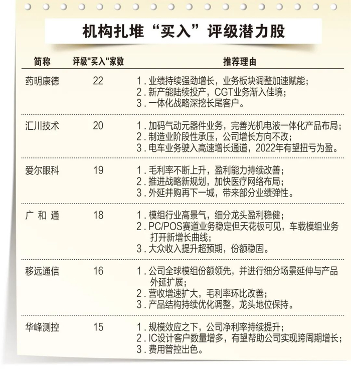 券商机构最新评级中,二十大潜力股的评级以“买入”、“增持”为主,去年以来共获得4023家机构调研,汇川技术、华峰测控调研机构均超过1000家。15只个股获得5家以上机构“买入”评级,其中,药明康德、汇川技术、爱尔眼科等9只个股获10家以上机构扎堆“买入”评级。