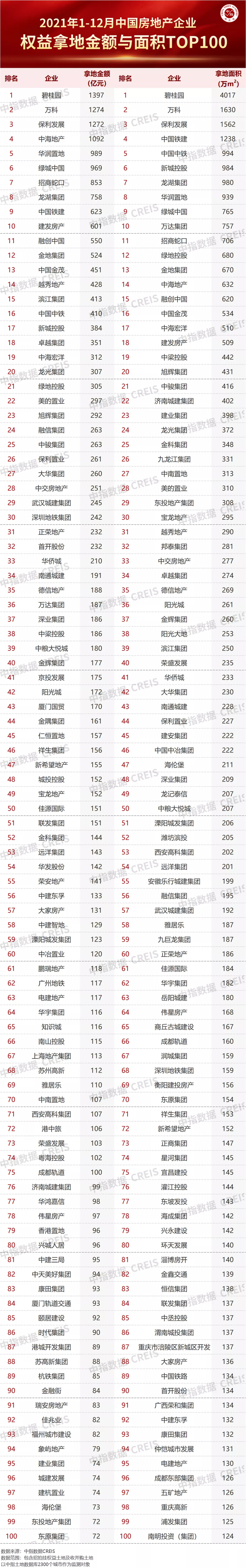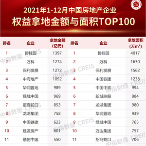 2021年中国房地产企业拿地TOP100