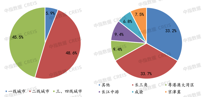 图:2021年50家代表房企拿地面积城市等级、区域分布情况