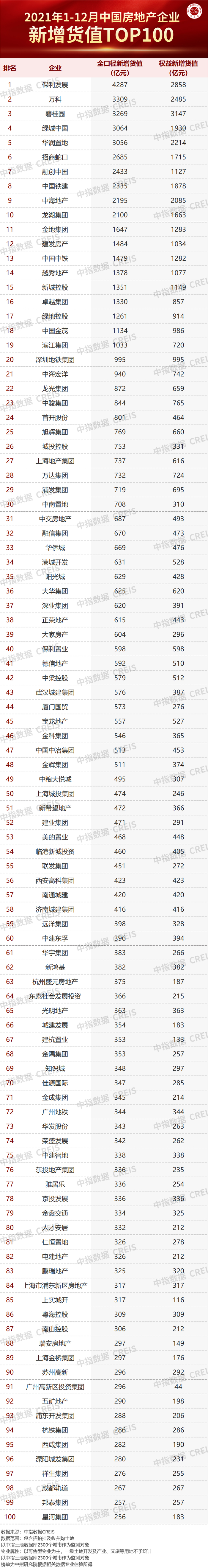 碧桂园、中国恒大、万科、融创中国、保利发展、中海地产、绿地控股、世茂集团、华润置地、招商蛇口、龙湖集团、绿城中国、新城控股、金地集团、中国金茂、旭辉集团、金科集团、中南置地、阳光城、正荣集团、融信集团、龙光集团、富力集团、佳兆业集团、滨江集团、雅居乐、奥园集团、祥生集团、美的置业、远洋集团、蓝光发展、荣盛发展、新力控股、禹洲集团、中国铁建、华发股份、中骏集团、新希望地产、合景泰富集团、中梁控股、首开股份、越秀地产、时代中国、金辉集团、佳源集团、弘阳地产、大悦城控股、仁恒置地、华宇集团、宝龙地产