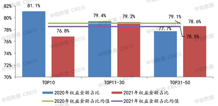50家代表房企招拍挂拿地权益金额占比均值略有下降。2021年,50家代表房企招拍挂权益金额占比均值为78.5%,较同期微降0.6个百分点,合作拿地力度基本保持稳定。具体来看,与去年同期相比,TOP11-30阵营企业拿地权益金额占比较为稳定,TOP10阵营企业拿地权益金额占比下降4.3个百分点,TOP31-50阵营企业拿地权益金额占比略微有所上升。