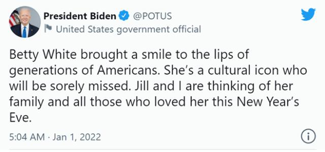 拜登当天发推称,“贝蒂·怀特给几代美国人带来了欢笑。她是一位将被深切怀念的文化偶像。(夫人)吉尔和我在这个新年前夜记挂着她的家人和所有爱她的人。”↓