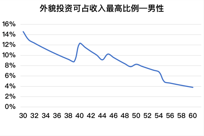 结果发现,如果只考虑美貌溢价带来的收入增长,在维持总体投资收益平衡的前提下,投资初期(30岁时)普通男性和女性最多只能拿出工资的15%和8%进行外貌投资。其他各个年龄阶段的具体比例如下: