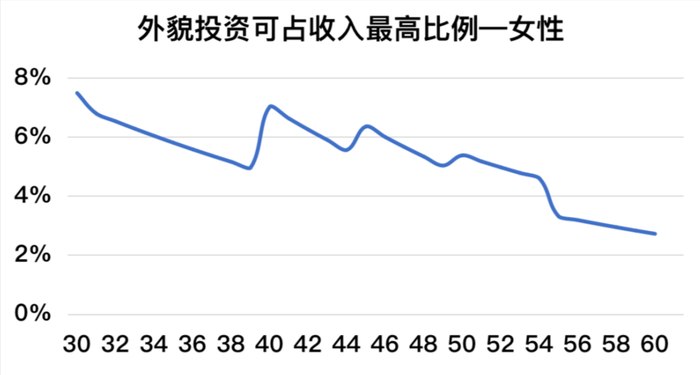 随着收入的提升,美貌投入占工资的比重整体呈下降趋势。但一个重要的策略是,在每一个人生的关键节点——包括衰老加速的年龄、晋升和工资增速变化的时候,增加投入或许是一个比较合理的投资策略,因为这样能为接下来的一个阶段打好基础,获得更多未来收益。