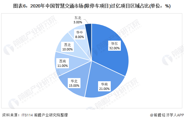 从招投标市场来看,据ITS114统计数据,截至12月31日,2020年城市智慧交通市场(除停车项目)中标过亿项目32个,中标过亿项目市场规模总计约为66.58亿。从中标项目的区域分布来看,华东与华南地区为我国智慧交通行业发展的主要区域,二者合计占比超过50%。因此,从整体区域分布来看,中国智慧交通企业的区域集中度较高。
