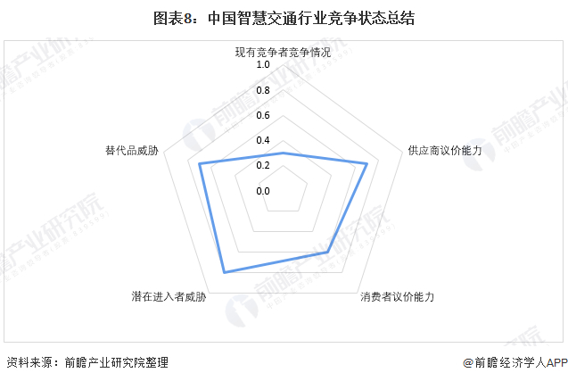 总体来看,目前我国智慧交通行业处于成长初期,整体竞争情况不太激烈。对各方面的竞争情况进行量化,1代表最大,0代表最小,具体五力竞争量化结果如下: