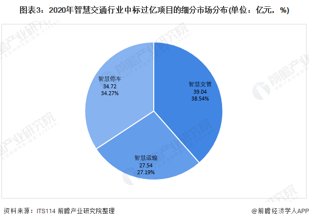 据ITS114统计数据,2020年城市智慧交通市场(包括智慧停车)中标过亿项目共46个,中标过亿项目市场规模总计约为101.27亿元。在46个中标金额过亿的智慧交通项目中,其中交通管控市场中标过亿项目21个,总计中标金额为39.04亿元;智慧运输(含智能网联)中标过亿项目11个,总计中标金额为27.54亿元;智慧停车中标过亿项目14个,总计中标金额为34.72亿元。