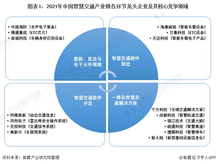 由于智慧交通细分领域众多,产业链分布范围广,因此各龙头企业的核心竞争领域均有不同。智慧交通产业上游制造商具体包括数据提供商、算法提供商与电子器件制造商,相关代表企业有中国海防、博通集成与金滋科技等,其核心竞争力分别为水声电子装备、ETC芯片与车辆身份识别设备。