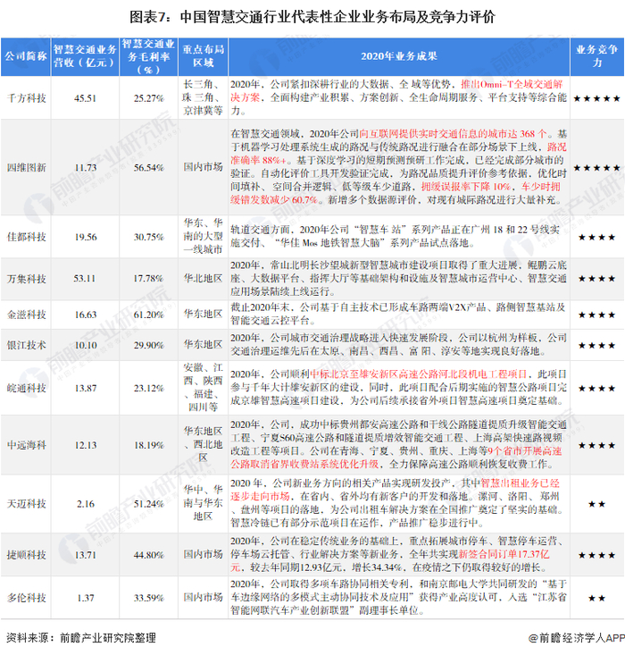 整体来看,千方科技、四维图新、佳都科技与万集科技等企业在中国智慧交通行业拥有较强的竞争力。