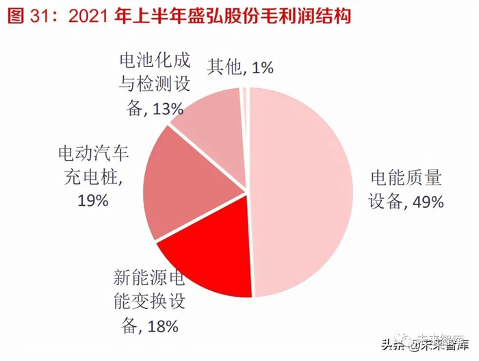 盛弘股份是国内工商业储能 PCS 龙头。盛弘股份成立于 2007 年,起步产品是电能质量设备,目 前公司的电能质量业务居于国内龙头地位。公司基于在电力电子领域深厚的技术积累,衍生出充电 桩、储能变流器、电池化成与检测设备等业务。2012 年,盛弘股份进军储能市场,以独特的模块 化储能变流器产品占领了市场先机。目前盛弘已在全球五大洲 50 余个国家和地区进行储能产业布 局,超 800 个储能项目稳定运行,全球累计装机容量超 700MW。产品覆盖 30kw 到 1000kw,能 够提供适应不同客户需求的产品。2021 年上半年公司储能业务实现收入 8400 万元,同比增长 216.59%,占总收入的 22%,毛利润中占比 18%。