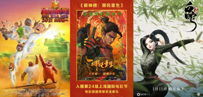 今年票房前25名的作品中,有《白蛇2:青蛇劫起》《熊出没·狂野大陆》和《新神榜:哪吒重生》三部动画电影,票房分别为5.8亿、5.5亿和4.5亿。并没能承接下票房超50亿的《哪吒之魔童降世》所掀起的国产动画电影热潮。年末上映的高口碑动画电影《雄狮少年》,却陷入“眯眯眼”的舆论争议之中,目前票房成绩在1.5亿左右,不及预期。