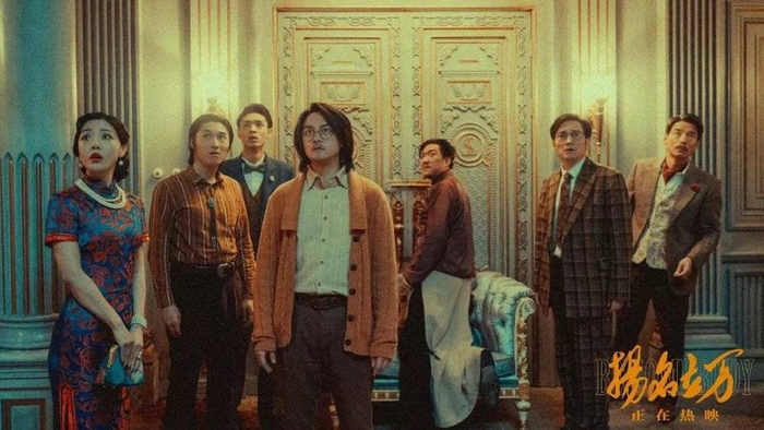 典型的万合天宜风格的无厘头搞笑,加上密室中的探案剧情,让观众很容易联想到当下正火热的剧本杀。尽管这部影片筹拍于2018年,导演甚至根本没玩过剧本杀,但有意无意的巧合依然给《扬名立万》起到助推作用。