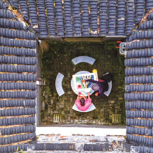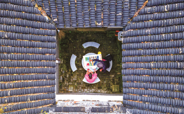 点评:这是江南民居独有的平面布局方式,由四合房围成的小院子通称天井,仅作采光和排水用,因为屋顶内侧坡的雨水从四面流入天井,寓意水聚天心,称为“四水归堂”。这幅照片正是利用了这个建筑特点,巧妙地将观者的视线引入天井中央。尽管伏在石桌上绘画的动作相对静止、乏善可陈,但是通过独特的机位角度,注入了视觉新鲜感。另外,黝黑的屋顶和鲜艳的画作形成色彩上的强烈对比,增添了画面跳动感。