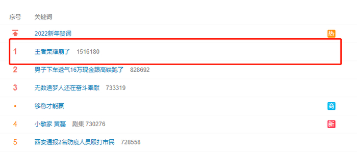 1月1日晚间微博热搜第一来自于王者荣耀。