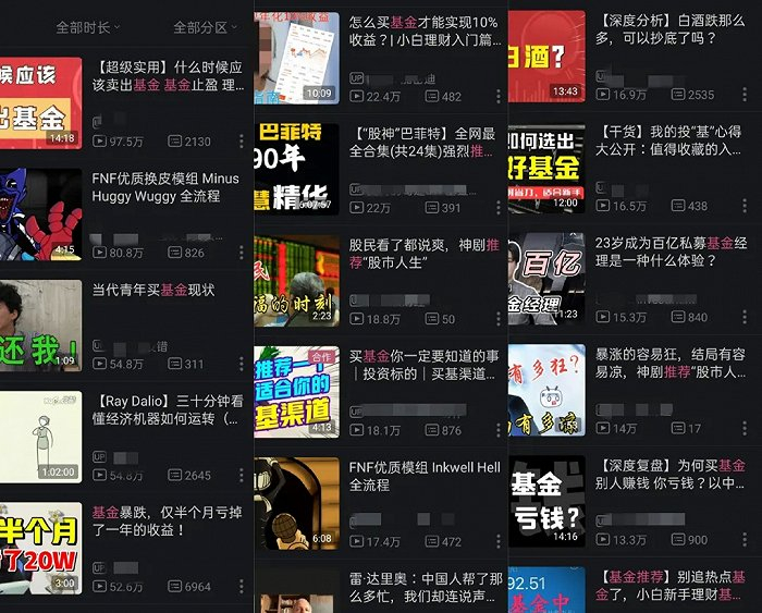 在去年年初基金火出圈的时候,B站、抖音、小红书等社交平台野生基金大V丛生。他们大多没有相应的资格证书,但是却凭借运气跟着市场赚到了钱,摇身一变开始自称基金UP主,在社交平台指点江山出教程,例如《教你组建完美的基金组合》《纯干货,教你辨别一只基金值不值得买》《赚爆,一年收益20万》……这些看上去就像收割韭菜的教程,偏偏播放量还不低,“10万+”轻轻松松。