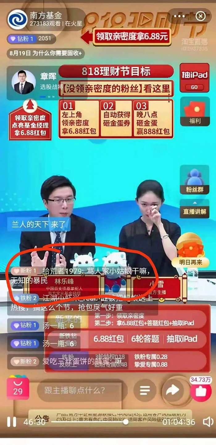 基民的攻击甚至来到了直播间。据北青财经报道,8月20日,有网友爆料,在南方基金的一场近30万人观看的直播中,一位名叫小雪的女主播,被基民弹幕攻击到情绪崩溃,当场哭了出来,事情根源于当天同场直播的基金经理林乐峰,其所管理的基金产品8个月遭遇了7.25%的回撤。
