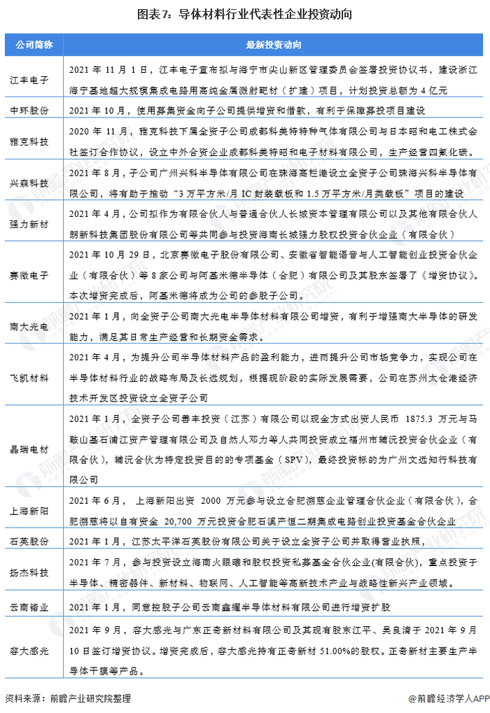 半导体材料行业代表性企业最新投资动向