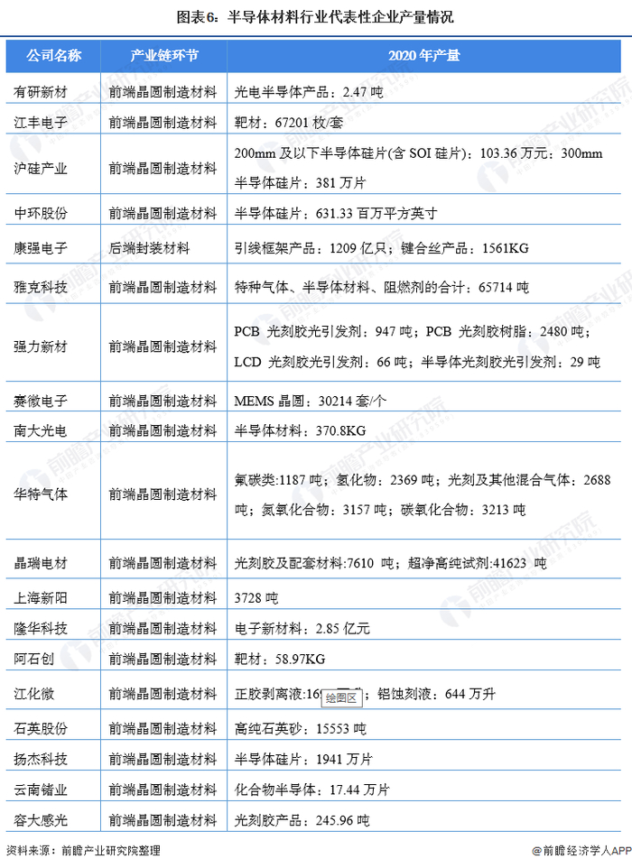 半导体材料行业代表性企业产量情况