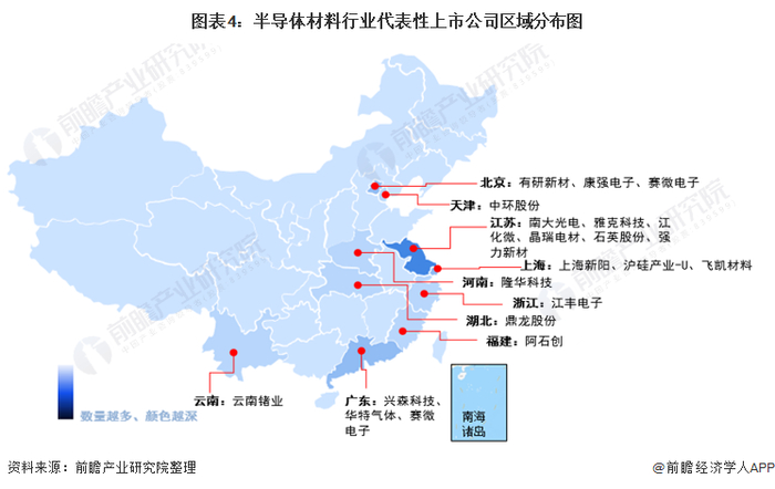 从代表性上市公司分布情况来看,北京、江苏、上海、广东等地的半导体材料上市公司数量较多。