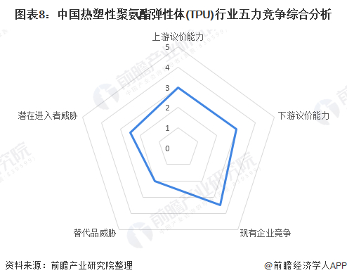 从五力竞争模型角度分析,目前,我国TPU行业属于有机高分子合成材料,兼具橡胶的高弹性和塑料的易加工性等优点,符合循环经济和可持续发展的要求,是未来新材料的主要发展方向之一,替代品威胁不大;现有竞争者中高端市场集中度较高;低端市场较为分散,企业规模偏小,规模效应不够明显,规模化竞争能力较为有限;上游供应商一般为上游主要包括MDI、多元醇、BDO、己二酸、EDO等原材料等企业,议价能力适中,而下游消费市场主要是鞋材、薄膜、电子电器、汽车配件、医疗设备、合成革等诸多领域,议价能力适中;同时,因行业存在严格的准入资质以及资金、技术门槛较高,潜在进入者威胁较小。