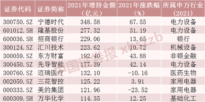 北向资金2021年加仓金额前十股