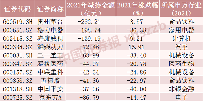 Wind数据显示,基于持股变动及个股成交均价进行估算,2021年北向资金对贵州茅台、格力电器、海康威视减持金额居前,分别净卖出282.21亿元、198.74亿元、139.19亿元。2021年北向资金减持金额居前十股票多数下跌,跌幅最大的为中国平安,2021年下跌40%,潍柴动力涨幅最大。