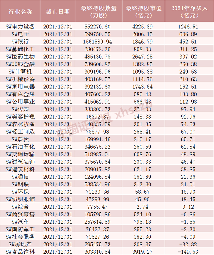 2021年北向资金对各行业增减持情况