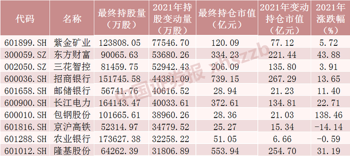 2021年北向资金持股增加数前十股