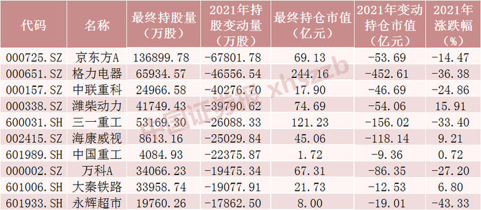 2021年北向资金减仓股数前十股