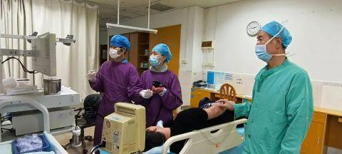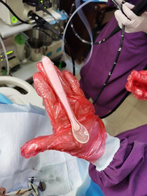 历经40分钟,一根长约17cm的粉色塑料勺子终于从胃内取出了。手术圆满结束后,患者家属悬着的一颗心也放下了,并向医务人员竖起大拇指点赞。
