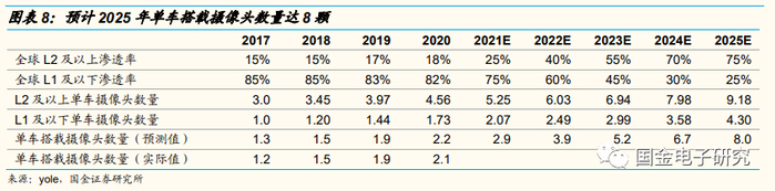 ◾ 预计2025年单车搭载摄像头数量达8颗,车载镜头市场规模超330亿元,CAGR超37%。1)车载摄像头是自动驾驶中必不可少的传感器,高级别自动驾驶推动摄像头量价齐升。目前主流自动驾驶级别在L2~L3阶段之间,一般搭载3~13颗摄像头。L4、L5级别自动驾驶ADAS系统尚在研发阶段,一般需要搭载13颗以上摄像头。2)根据TSR,2020年全球车载摄像头出货量达1.65亿颗、过去十年CAGR达30%,单车搭载摄像头数量达2.1颗。3)我们参考智能手机渗透速度,2010年智能手机渗透率从19%提升至2015年的74%。预计L2渗透率从2020年的18%提升至2025年的75%。我们假设2017年L2及以上单车搭载摄像头数量为3颗、此后每年单车搭载摄像头数量以15%的速度增长、2025年单车搭载摄像头数量达9颗,目前部分新势力单车搭载数量达13颗。我们假设2017年L1及以下单车搭载摄像头数量为1颗、此后每年单车搭载摄像头数量以20%的速度增长、2025年单车搭载摄像头数量达4颗。预计2025年单车搭载摄像头数量达8颗。