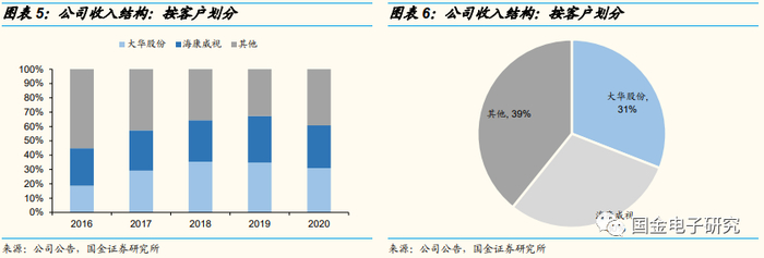 ◾ 公司前两大客户为安防龙头海康、大华,收入占比超60%。海康、大华在全球安防摄像机市占率超40%,是安防行业的龙头。2020年海康、大华为公司贡献收入达4.4、4.6亿元,二者占比达61%,自2017~2020年海康、大华营收贡献稳定在60%的水平。