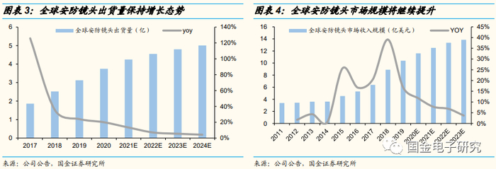 ◾ 公司是安防镜头行业龙头,市占率近40%。1)2020年全球安防镜头市场CR6为74%,较去年下降5pct。公司是全球安防镜头龙头,市占率第一、2020年达到39%,较去年提升3pct。2)2020年全球安防镜头销量达3.75亿件,同比增长20%,预计未来伴随小微企业、农村专业安防需求放量,消费安防镜头快速增长,预计2024全球安防镜头年出货量将达到5亿颗,四年CAGR为7.5%。2019年全球安防监控镜头市场规模为10亿美元,预计2023年市场规模达到14亿美元,四年CAGR为7.5%。