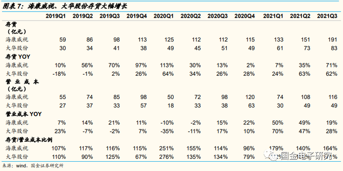 ◾ 安防行业进入去库存周期,景气度边际趋弱。1)从存货绝对值来看,2021年Q3海康威视存货达191亿元、同增71%、环增26%,大华股份存货达83亿元、同增62%、环增13%。从存货与营业成本的比值来看,海康威视、大华股份存货与营业成本的比值达164%、171%,同比、环比大幅攀升。2)从存货明细来看,2021年H1海康威视存货中存货商品、原材料同增57%、35%,大华股份存货中存货商品、原材料同增61%、89%。3)我们认为安防企业库存高企主要系此前受缺芯影响大量囤积原材料、产成品,预计伴随需求增速回落,安防行业进入去库存周期。