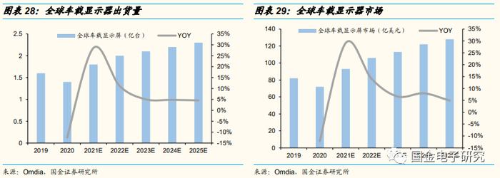 ◾ 需求端:在大屏化、多屏化的推动下,预计2022年车载显示屏需求同增14%,预计未来稳健增长。2020年全球车载显示屏出货量为1.4亿台,市场规模为72亿美元,2021年前三季度全球车载显示屏出货量达1.2亿台、同增30%,预计2021年全球车载显示屏出货量达1.8亿台、同增29%。预计2022年车载显示屏出货量为2亿台、同增11%,车载显示屏市场规模为106亿美元、同增14%。主要受益于汽车智能化(大屏化+多屏化)对显示屏需求的拉动。
