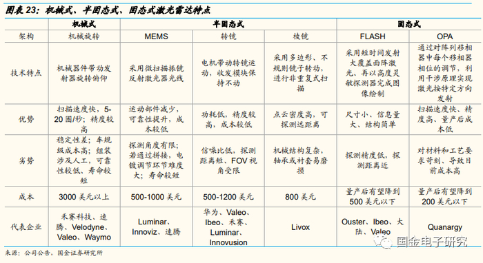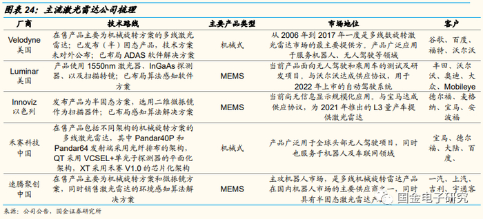 ◾ 供给端:1)全球范围内激光雷达玩家包括法雷奥、Luminar、电装、大陆、Innoviz,以及国内的华为、大疆、禾赛科技、速腾聚创、万集科技等企业。2020年法雷奥、速腾聚创市占率达28%、10%,领先行业。2)从技术路线上来看,激光雷达按照光束操纵方式可分为机械式、半固态及固态式。机械式目前最为成熟、产量最高,主要应用于无人驾驶,但使用寿命限制难过车规要求;MEMS微振镜、转镜、棱镜等半固态式激光雷达陆续通过车规,并已少量前装量产,近年内或形成放量;长期来看FLASH、OPA的固态式方案均可能成为主导路线。2020年在全球汽车与工业激光雷达市场中机械式占比达66%、MEMS占比达17%、Flash占比达10%。2)从技术路线上来划分,Velodyne、禾赛科技主要为机械式产品,但是机械式产品由于寿命受限难以进入前装市场。Luminar、速腾聚创、Innoviz、大疆、华为等企业积极布局半固态/固态激光雷达。