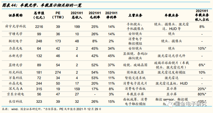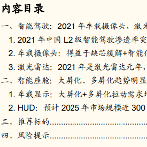 ◾ 展望2022年,看好汽车智能化下的车载摄像头、激光雷达、显示屏、HUD的投资机会。建议关注舜宇光学科技(车载镜头龙头,积极布局车载模组、激光雷达、HUD、智能大灯业务)、宇瞳光学(安防镜头龙头积极布局车载镜头领域,预计22年后装产品批量供应)、联创电子(车载镜头先发优势明显,特斯拉、蔚来车载镜头供应商)、力鼎光电、永新光学(激光雷达镜头、光学零部件核心供应商)、炬光科技(大陆、H客户激光雷达核心供应商,2020年、2021年H1公司智能辅助驾驶产业销售收入为0.31、0.21亿元)、蓝特光学(车载镜头、激光雷达的非球面玻璃镜片核心供应商)、万集科技(已发布混合固态128线车规级激光雷达,2020年公司激光雷达实现营收超1亿元)、水晶光电(AR-HUD、激光雷达视窗玻璃供应商)、京东方精电(车载显示大尺寸屏龙头)、深天马(全球车载显示龙头)、长信科技。