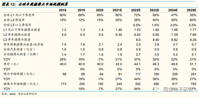 ◾ 单车搭载摄像头预测:假设2020年L2级自动辅助驾驶单车搭载摄像头6颗,对应L1及以下单车搭载摄像头为1.4颗,假设L3即自动辅助驾驶单车搭载摄像头8颗。考虑各家车厂做车型迭代中摄像头数量持续增加,假设未来每年单车搭载摄像头同增5%。