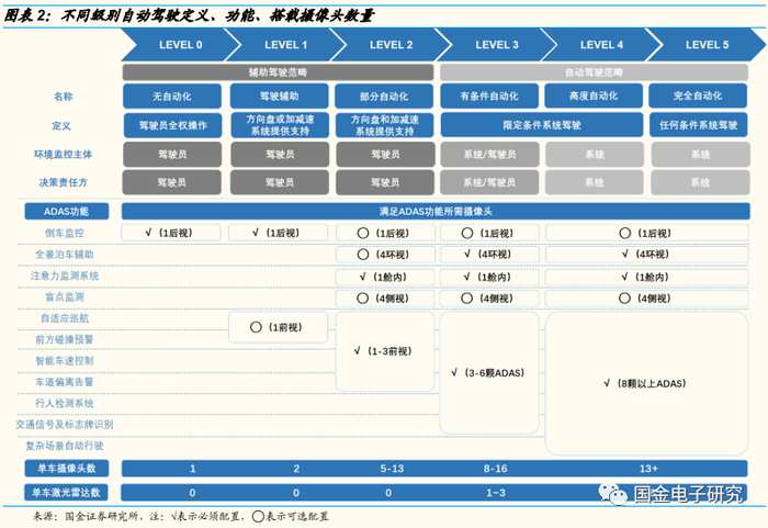 ◾ 我们认为摄像头和激光雷达优势互补,都是智能辅助驾驶必不可少的传感器, L2级别智能辅助驾驶搭载5~8颗摄像头,L3级别智能辅助驾驶搭载8~16颗摄像头及1~3颗激光雷达,L4、L5级别自动驾驶ADAS系统尚在研发阶段,一般需要搭载13颗以上摄像头及4~6颗激光雷达。