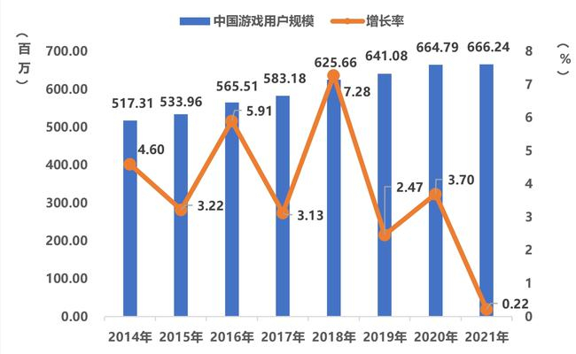 中国音数协游戏工委发布的《2021年中国游戏产业报告》显示,中国游戏用户规模达 6.66 亿人,同比仅增长 0.22%。