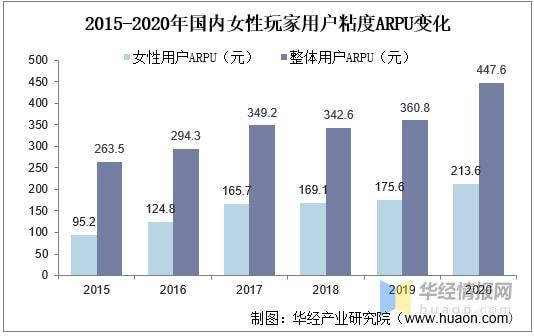 在消费能力上,目前女性用户 ARPU 值仅为整体游戏用户 ARPU 值的一半,但呈现出快速上涨趋势。从 2015-2020 年,女性玩家的 ARPU 值从 95.2 增长到了 213.6元,增幅达 124%,远高于整体用户 69% 的增幅。