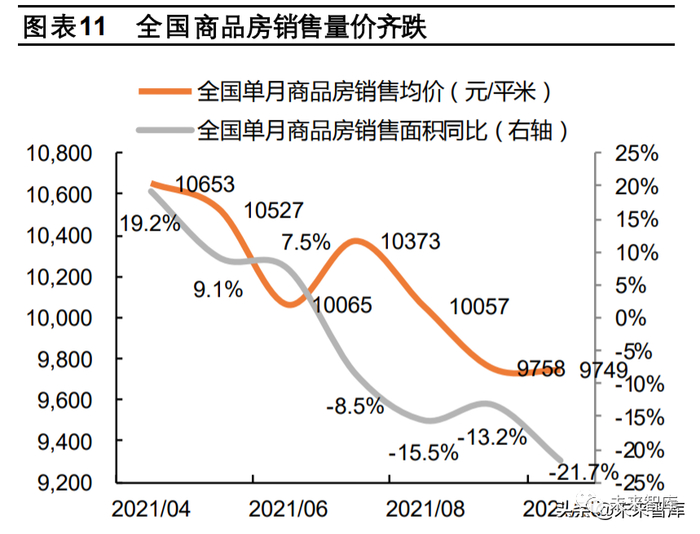需求透支及流动性问题冲击,销售急转直下。2016-2020年全国商品房年销售面积 15亿平米以上;2021年 1-10 月累计销 售 14.3 亿平米,同比增长 7.3%。楼市成交持续高位运行,需求存在透支可能性。2021 年下半年中大型房企流动性问题引 发购房担忧,加上房地产税试点提速加重观望情绪,导致销售超预期下行。2021年 10月全国单月销售面积同比下降 21.7%, 较 2 月高点(104.9%)降 126.5 个百分点,下行速度及幅度创近十年之最。