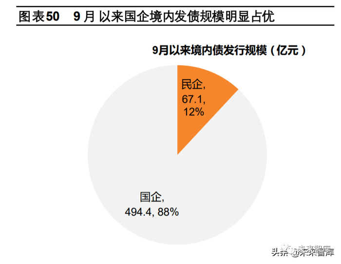 房企间分化加剧,央国企及优质民企为代表的稳健房企相对受益。由于信用事件冲击,部分房企可能信用受损、融资不畅, 或被动出清或收缩投资下规模萎缩。相较而言,央国企及优质民企更能受益信贷端松动,把握土地市场降温带来的拿地机会。2021 年 9 月以来国企境内发债规模显著优于民企,第二批集中供地国企拿地规模亦相对更多。