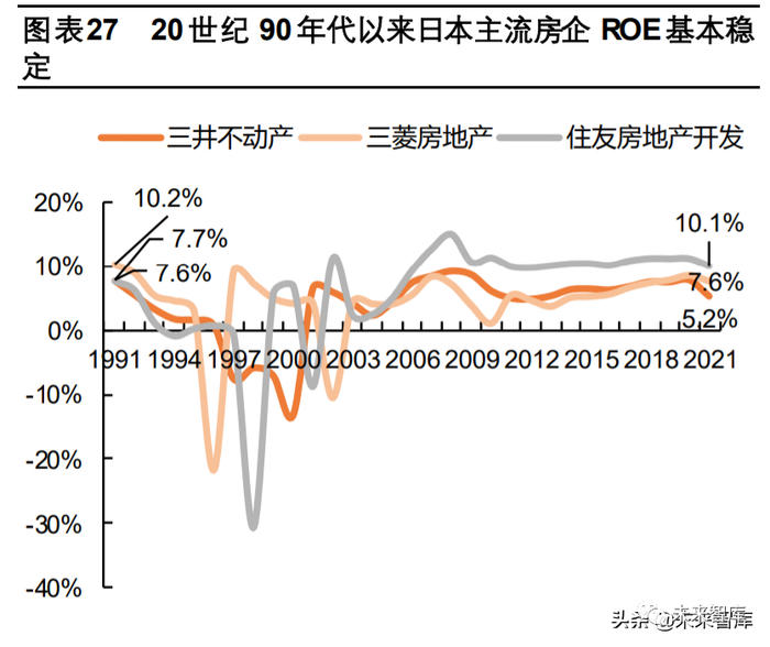 传统开发由金融红利转向管理红利。由于新金融监管环境下传统模式适用性降低,未来“高杠杆、高周转”模式预计将向低 杠杆、低负债经营转变,由向金融要红利转为向管理、运营要利润。参考20世纪 90年代日本房地产泡沫破灭前后情形。1991财年三井不动产、三菱房地产、住友房地产开发 ROE分别为7.6%、 10.2%、7.7%,2021财年分别为 5.2%、7.6%、10.1%,基本维持稳定。
