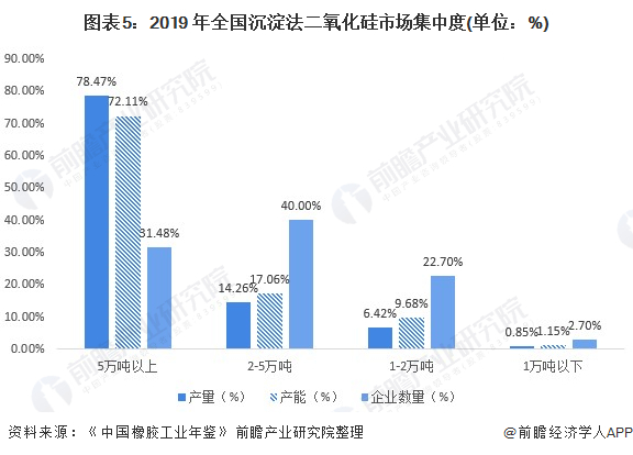 从企业规模看,沉淀法二氧化硅生产企业向规模化、大型化和集中化发展。截至2019年底,国内沉淀二氧化硅生产厂家共54家,其中规模在5万吨以上的企业数量17家,企业数量占比78.47%,产能在5万吨以上的企业总产能占比72.11%,产量占比31.48%。整体来看,我国沉淀法二氧化硅行业集中度主要集中在5万吨以上企业。