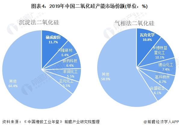 目前,中国二氧化硅行业两大龙头企业分别是确成股份和瓦克化学。2020年,沉淀法二氧化硅来看,确成股份市场份额达11.7%,其他企业沉淀法二氧化硅产能市场占比均低于10%;气相法二氧化硅龙头瓦克化学的市场份额达10.8%,其次为蓝星化工,产能占比为10.1%。