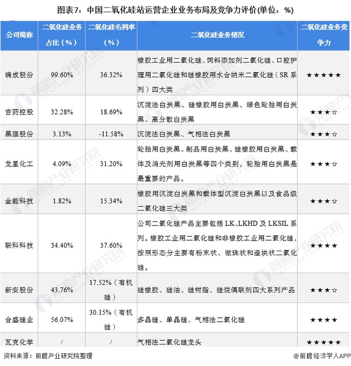 从企业二氧化硅业务的竞争力来看,确成股份、瓦克化学二氧化硅的竞争力排名较强;其次合盛硅业、联科科技等也是领先的二氧化硅供应商。