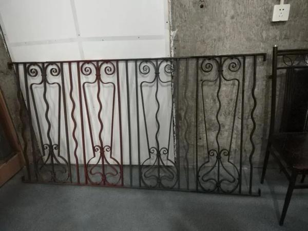 铁艺栏杆样板段修缮,从左至右为除锈前、除锈并上红丹底漆后、灰色饰面、黑色饰面