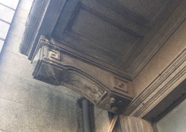 建筑外墙是20世纪初上海英式建筑常见的水刷石饰面,又称Shanghai Plaster,利用水泥抹灰中掺石子的手法模拟石材效果,是上海近现代建筑遗产中的一大特色工艺。沙美大楼修缮前,立面水刷石污染严重,有些后期修补的部位或产生空鼓等安全问题,或由于后期修补材料、手法不当而造成立面“花脸”的效果。
