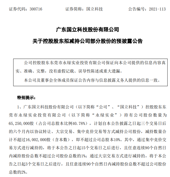 此前,国立科技也曾披露持股5%以上股东、特定股东及其一致行动人减持相关的消息。例如,国立科技12月6日公告,2021年7月8日至2021年12月6日期间,股东盛和伟业减持了1%公司股份。根据公告,盛和伟业持有7.37的国立科技股份,计划减持比例为不超过公司总股本的6%。这意味着盛和伟业减持计划尚未执行完毕。